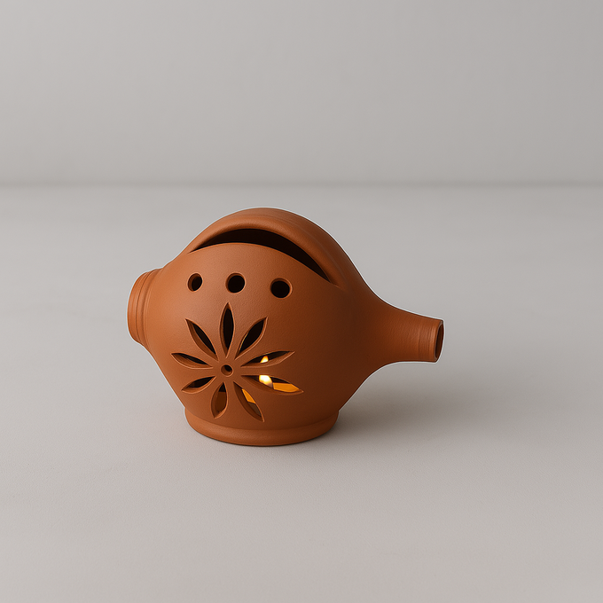 A handcrafted terracotta candle holder, shaped like a conch shell (Shanku) with intricate floral cut-outs. Made from red clay, it casts soft, patterned light when lit and adds a touch of traditional elegance to any space.